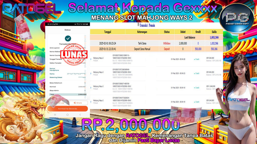Selamat kepada member setia RATOGEL yang sudah berhasil menang SLOT MAHJONG WAYS 2 di situs RATOGEL ID : Gexxxx DEPO : 500.000 JACKPOT : 2.000.000 RATOGEL MENANG BERAPAPUN DI BAYAR…